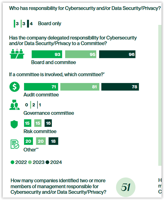 The report's deep dive on cybersecurity disclosure practices is particularly noteworthy in view of the still relatively new SEC risk management, strategy, governance, and incident reporting requirements. Key benchmarking results include: