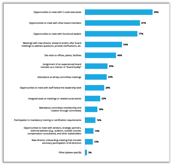 Orientation/Onboarding practices (n=101)—Among potential enumerated practices, a majority of companies provide their orientation and onboarding materials online (e.g., posting on a secure site or board portal); have a structured schedule or timeline for the process; and regularly review the process for necessary updates, while half have a process to solicit feedback from new directors on the effectiveness of their integration.