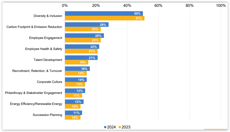 Types—Social metrics (most commonly, diversity and inclusion) led environmental, governance, and “other” ESG metrics by a wide margin, at 68%, 39%, 30%, and 26% respectively. Carbon footprint and emission reductions and succession planning were the most prevalent environmental and governance metrics, respectively.